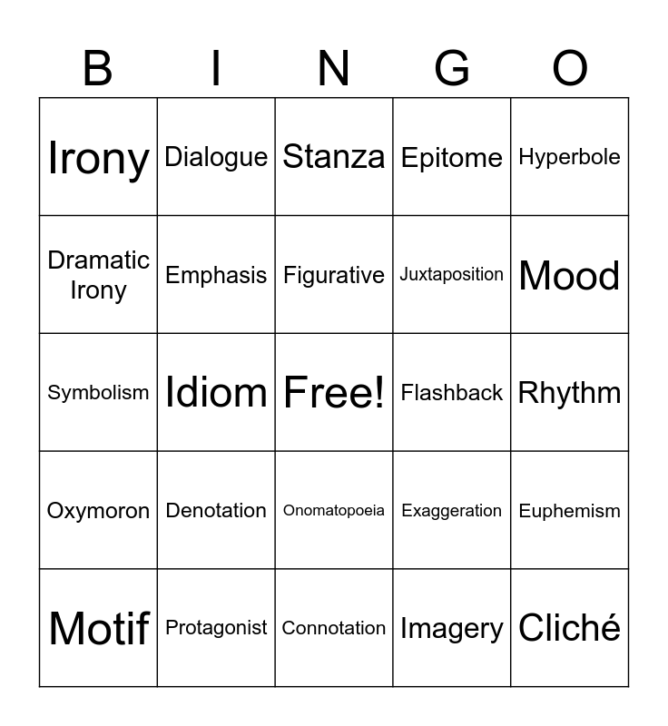 This bingo card has a free space and 48 words: Caricature, Cliché, Climax, Connotation, Denotation, Dialect, Dialogue, Diction, Dramatic Irony, Elegy, Emphasis, Epitome, Euphemism, Exaggeration, Exposition, Fable, Figurative, Flashback, Foreshadowing, Hyperbole, Idiom, Imagery, Irony, Juxtaposition, Metaphor, Mood, Motif, Narrator, Onomatopoeia, Oxymoron, Paradox, Parody, Personification, Plot, Protagonist, Resolution, Rhyme, Rhythm, Satire, Setting, Simile, Soliloquy, Stanza, Stereotype, Symbolism, Theme, Tone and Tragedy.