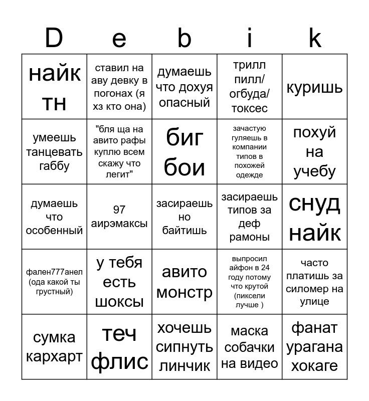 This bingo card has a free space and 24 words: у тебя есть шоксы, теч флис, биг бои, сумка кархарт, куришь, найк тн, умеешь танцевать габбу, ставил на аву девку в погонах (я хз кто она), засираешь типов за деф рамоны, авито монстр, зачастую гуляешь в компании типов в похожей одежде, думаешь что особенный, выпросил айфон в 24 году потому что крутой (пиксели лучше ), часто платишь за силомер на улице, "бля ща на авито рафы куплю всем скажу что легит", маска собачки на видео, снуд найк, думаешь что дохуя опасный, похуй на учебу, 97 аирэмаксы, фанат урагана хокаге, фален777анел (ода какой ты грустный), трилл пилл/огбуда/токсес and хочешь сипнуть линчик.