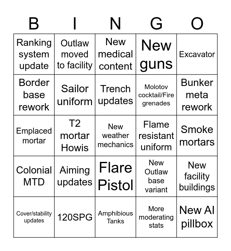 This bingo card has a free space and 24 words: Aiming updates, 120SPG, Trench updates, Cover/stability updates, Excavator, Ranking system update, Border base rework, Outlaw moved to facility, Flame resistant uniform, Flare Pistol, Molotov cocktail/Fire grenades, Emplaced mortar, New Outlaw base variant, New facility buildings, Sailor uniform, More moderating stats, Smoke mortars, New medical content, Bunker meta rework, T2 mortar Howis, New AI pillbox, Colonial MTD, New guns and Amphibious Tanks.