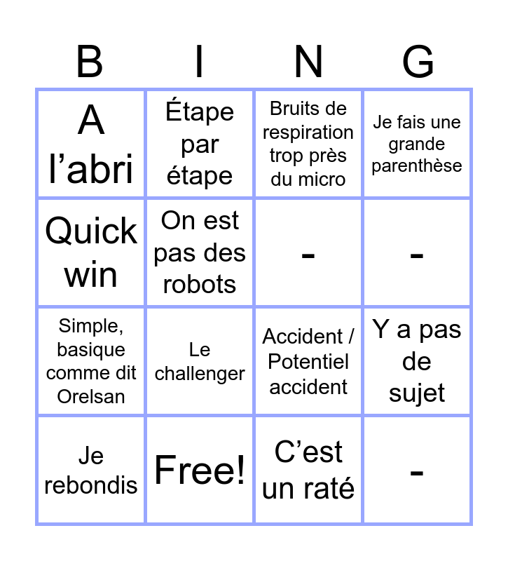 This bingo card has 16 words: Free!, Y a pas de sujet, Bruits de respiration trop près du micro, A l’abri, Simple, basique comme dit Orelsan, Étape par étape, Accident / Potentiel accident, C’est un raté, Quick win, On est pas des robots, Je rebondis, Je fais une grande parenthèse, Le challenger, -, - and -.