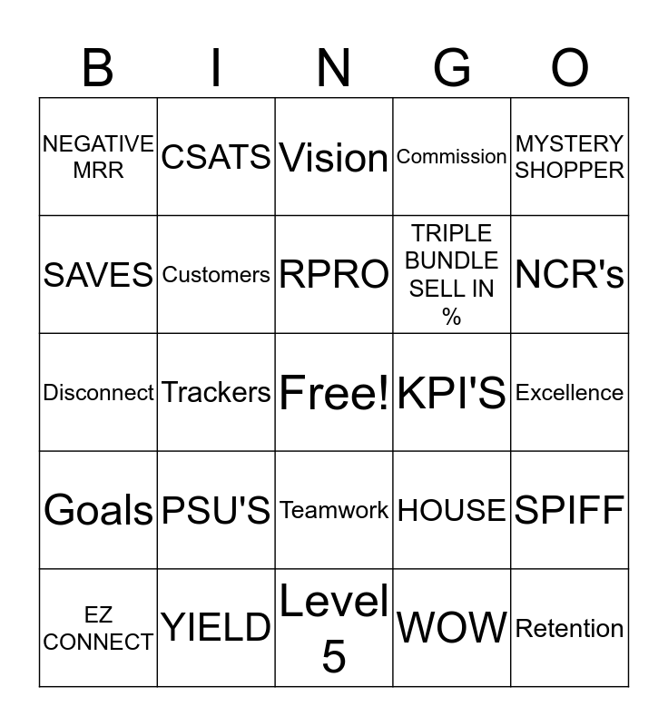 This bingo card has a free space and 24 words: PSU'S, YIELD, RPRO, EZ CONNECT, MYSTERY SHOPPER, NEGATIVE MRR, SAVES, CSATS, KPI'S, Teamwork, TRIPLE BUNDLE SELL IN %, Disconnect, HOUSE, SPIFF, Customers, WOW, Excellence, Vision, NCR's, Trackers, Retention, Goals, Commission and Level 5.