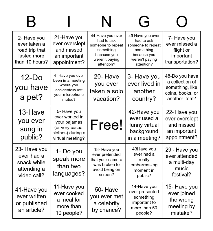 This bingo card has a free space and 24 words: 1- Do you speak more than two languages?, 11-Have you ever cooked a meal for more than 10 people?, 20- Have you ever taken a solo vacation?, 41-Have you ever written or published an article?, 7- Have you ever missed a flight or important transportation?, 2- Have you ever taken a road trip that lasted more than 10 hours?, 12-Do you have a pet?, 21-Have you ever overslept and missed an important appointment?, 42-Have you ever used a funny virtual background in a meeting?, 18- Have you ever pretended that your camera was broken to avoid being on screen?, 3- Have you ever lived in another country?, 13-Have you ever sung in public?, 43Have you ever had a really embarrassing moment in public?, 29 - Have you ever attended a multi-day music festival?, 4- Have you ever been in a meeting where you accidentally left your microphone muted?, 14-Have you ever presented something important to more than 50 people?, 22- Have you ever overslept and missed an important appointment?, 44-Have you ever had to ask someone to repeat something because you weren’t paying attention?, 48-Do you have a collection of something, like coins, books, or another item?, 5- Have you ever worked in your pajamas (or very casual clothes) during a virtual meeting?, 15- Have you ever joined the wrong meeting by mistake?, 23- Have you ever had a snack while attending a video call?, 45 Have you ever had to ask someone to repeat something because you weren’t paying attention? and 50- Have you ever met a celebrity by chance?.