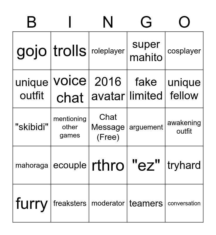 This bingo card has a free space and 24 words: ecouple, freaksters, 2016 avatar, furry, cosplayer, gojo, unique outfit, trolls, arguement, rthro, fake limited, "skibidi", "ez", tryhard, voice chat, teamers, awakening outfit, roleplayer, unique fellow, mentioning other games, conversation, mahoraga, super mahito and moderator.