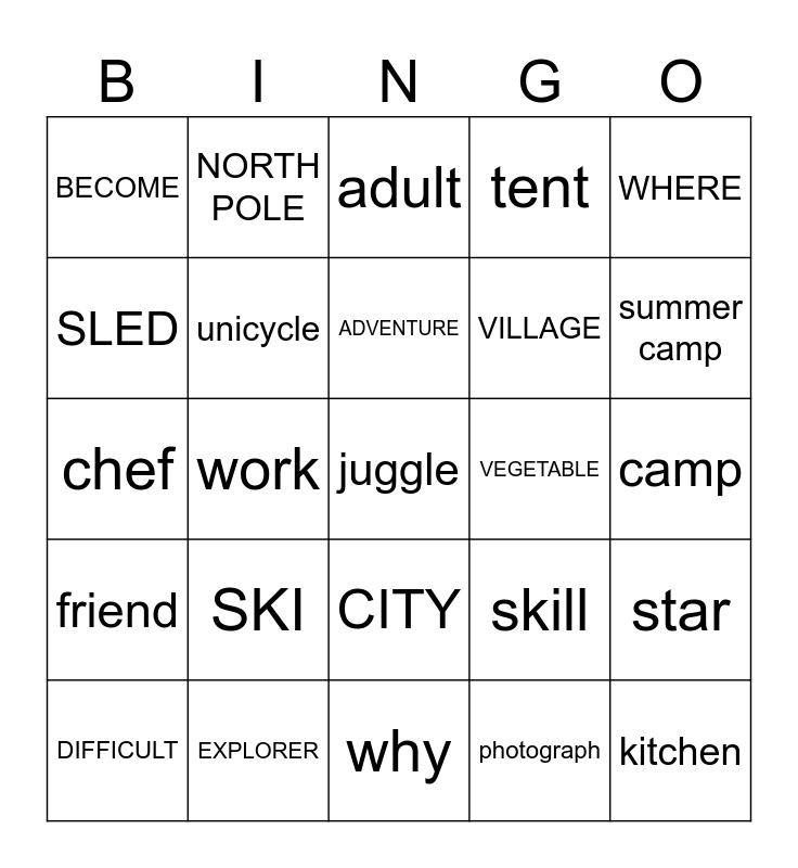 This bingo card has a free space and 24 words: SKI, EXPLORER, ADVENTURE, DIFFICULT, WHERE, BECOME, SLED, NORTH POLE, VEGETABLE, CITY, VILLAGE, chef, skill, star, unicycle, photograph, camp, adult, summer camp, work, kitchen, friend, tent and why.