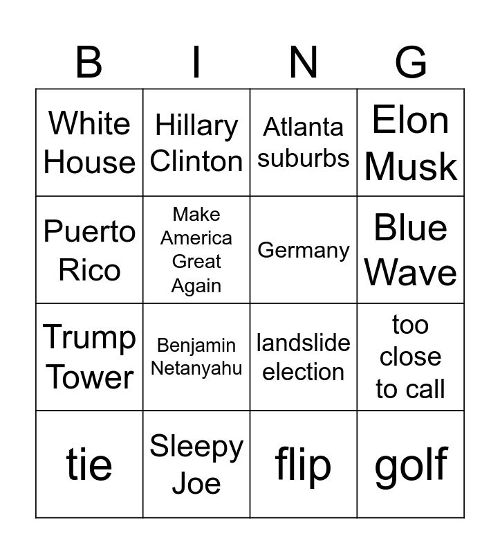 This bingo card has 16 words: Sleepy Joe, too close to call, Atlanta suburbs, White House, Trump Tower, Hillary Clinton, landslide election, flip, Puerto Rico, Make America Great Again, tie, Elon Musk, Benjamin Netanyahu, Blue Wave, Germany and golf.