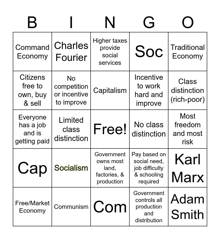 This bingo card has a free space and 24 words: Socialism, Communism, Capitalism, Free/Market Economy, Traditional Economy, Command Economy, Citizens free to own, buy & sell, Charles Fourier, No class distinction, Government owns most land, factories, & production, Incentive to work hard and improve, Everyone has a job and is getting paid, Pay based on social need, job difficulty & schooling required, Karl Marx, No competition or incentive to improve, Government controls all production and distribution, Most freedom and most risk, Higher taxes provide social services, Class distinction (rich-poor), Limited class distinction, Adam Smith, Cap, Soc and Com.