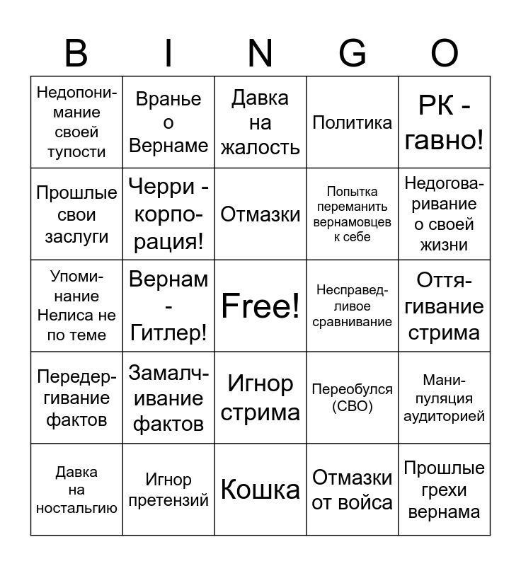 This bingo card has a free space and 24 words: Замалч- ивание фактов, Игнор претензий, Отмазки, Давка на ностальгию, РК - гавно!, Недопони- мание своей тупости, Прошлые свои заслуги, Вранье о Вернаме, Несправед-ливое сравнивание, Игнор стрима, Попытка переманить вернамовцев к себе, Упоми-нание Нелиса не по теме, Переобулся (СВО), Мани-пуляция аудиторией, Черри - корпо- рация!, Отмазки от войса, Оття-гивание стрима, Давка на жалость, Недогова-ривание о своей жизни, Вернам - Гитлер!, Прошлые грехи вернама, Передер- гивание фактов, Политика and Кошка.