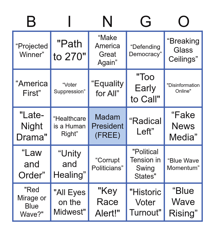 This bingo card has a free space and 37 words: “Counting Every Vote”, “Blue Wall”, “Fake Polls”, “Voter Suppression”, “Blue Wave Momentum”, “Unity and Healing”, “Equality for All”, “Fighting for the Middle Class”, “Breaking Glass Ceilings”, “Climate Action Now”, “Healthcare is a Human Right”, “Defending Democracy”, “Blue Wave Rising”, “Fake News Media”, “America First”, “Law and Order”, “Witch Hunt!”, “Make America Great Again”, “Corrupt Politicians”, “Radical Left”, “Projected Winner”, "Disinformation Online", "Red Mirage or Blue Wave?", "Key Race Alert!", "Election Night Shockers", "Historic Voter Turnout", "Path to 270", "Both Sides Watching Closely", "Millions of Votes Still Uncounted", "Brace for Delays in Results", "Breaking Down Voter Demographics", "All Eyes on the Midwest", "Late-Night Drama", "Who Will Control Congress?", "Political Tension in Swing States", "Too Early to Call" and "Eyes on Key Senate Races".