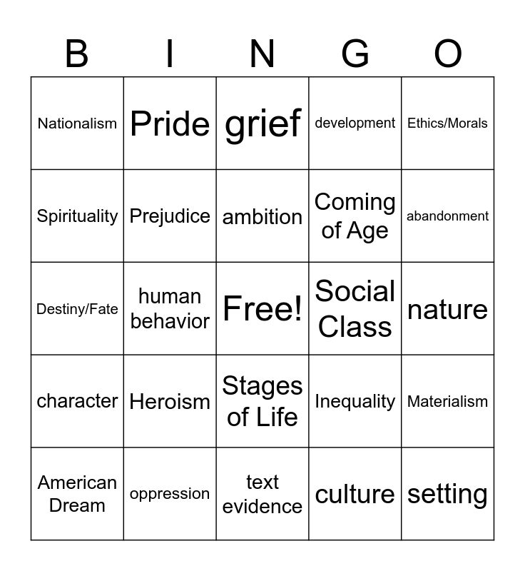 This bingo card has a free space and 24 words: Heroism, oppression, ambition, American Dream, Ethics/Morals, Nationalism, Spirituality, Pride, Social Class, Stages of Life, Coming of Age, Destiny/Fate, Inequality, Materialism, Prejudice, culture, nature, grief, abandonment, human behavior, setting, character, development and text evidence.