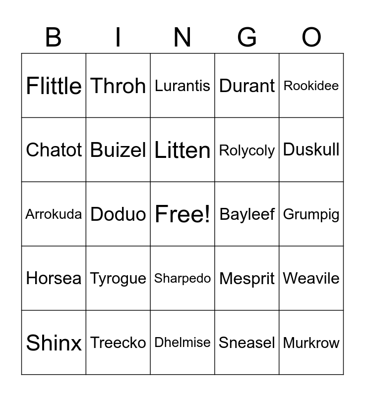 This bingo card has a free space and 24 words: Tyrogue, Treecko, Litten, Shinx, Rookidee, Flittle, Chatot, Throh, Bayleef, Sharpedo, Rolycoly, Arrokuda, Mesprit, Weavile, Buizel, Sneasel, Grumpig, Lurantis, Duskull, Doduo, Murkrow, Horsea, Durant and Dhelmise.