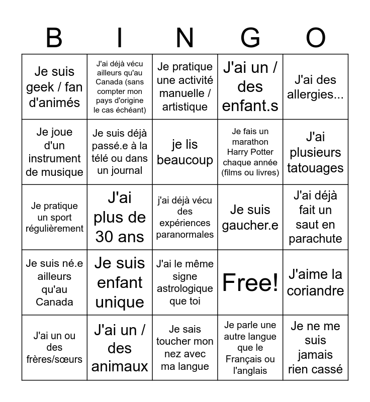 This bingo card has 25 words: Je suis enfant unique, Je sais toucher mon nez avec ma langue, je lis beaucoup, J'ai un ou des frères/sœurs, J'ai des allergies..., Je suis geek / fan d'animés, Je joue d'un instrument de musique, J'ai déjà vécu ailleurs qu'au Canada (sans compter mon pays d'origine le cas échéant), Je suis gaucher.e, J'ai le même signe astrologique que toi, Je fais un marathon Harry Potter chaque année (films ou livres), Je pratique un sport régulièrement, Free!, J'aime la coriandre, Je suis déjà passé.e à la télé ou dans un journal, Je ne me suis jamais rien cassé, J'ai déjà fait un saut en parachute, Je pratique une activité manuelle / artistique, J'ai plusieurs tatouages, J'ai plus de 30 ans, j'ai déjà vécu des expériences paranormales, J'ai un / des animaux, Je suis né.e ailleurs qu'au Canada, J'ai un / des enfant.s and Je parle une autre langue que le Français ou l'anglais.