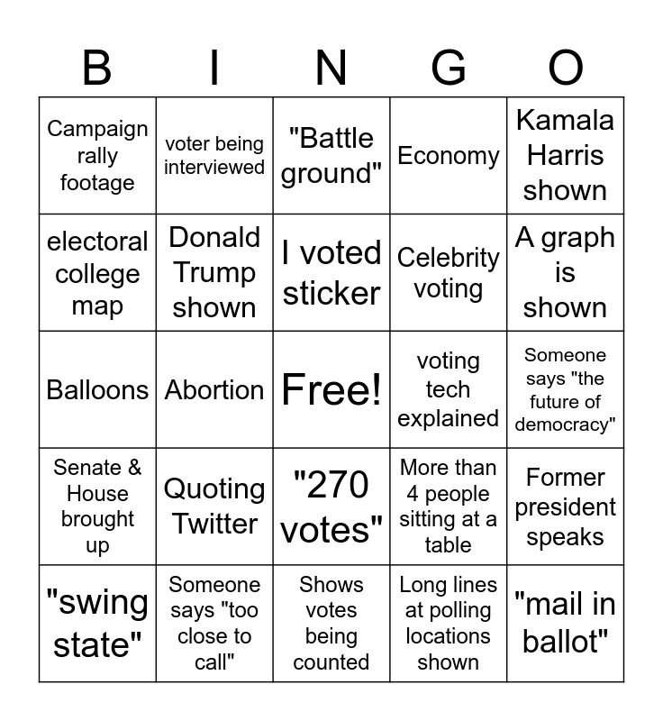 This bingo card has a free space and 24 words: Quoting Twitter, Someone says "too close to call", I voted sticker, "swing state", Kamala Harris shown, Campaign rally footage, electoral college map, voter being interviewed, voting tech explained, "270 votes", Celebrity voting, Balloons, More than 4 people sitting at a table, Former president speaks, Donald Trump shown, Long lines at polling locations shown, Someone says "the future of democracy", "Battle ground", A graph is shown, Abortion, "mail in ballot", Senate & House brought up, Economy and Shows votes being counted.