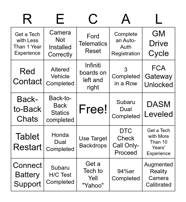 This bingo card has a free space and 24 words: Honda Dual Completed, Subaru H/C Test Completed, Infiniti boards on left and right, Connect Battery Support, GM Drive Cycle, Get a Tech with Less Than 1 Year Experience, Red Contact, Camera Not Installed Correctly, Subaru Dual Completed, Use Target Backdrops, 3 Completed in a Row, Back-to-Back Chats, DTC Check Call Only-Proceed, Get a Tech with More Than 10 Years' Experience, Altered Vehicle Completed, 94%er Completed, DASM Leveled, Ford Telematics Reset, FCA Gateway Unlocked, Back-to-Back Statics completed, Augmented Reality Camera Calibrated, Tablet Restart, Complete an Auto-Auth Registration and Get a Tech to Yell "Yahoo".