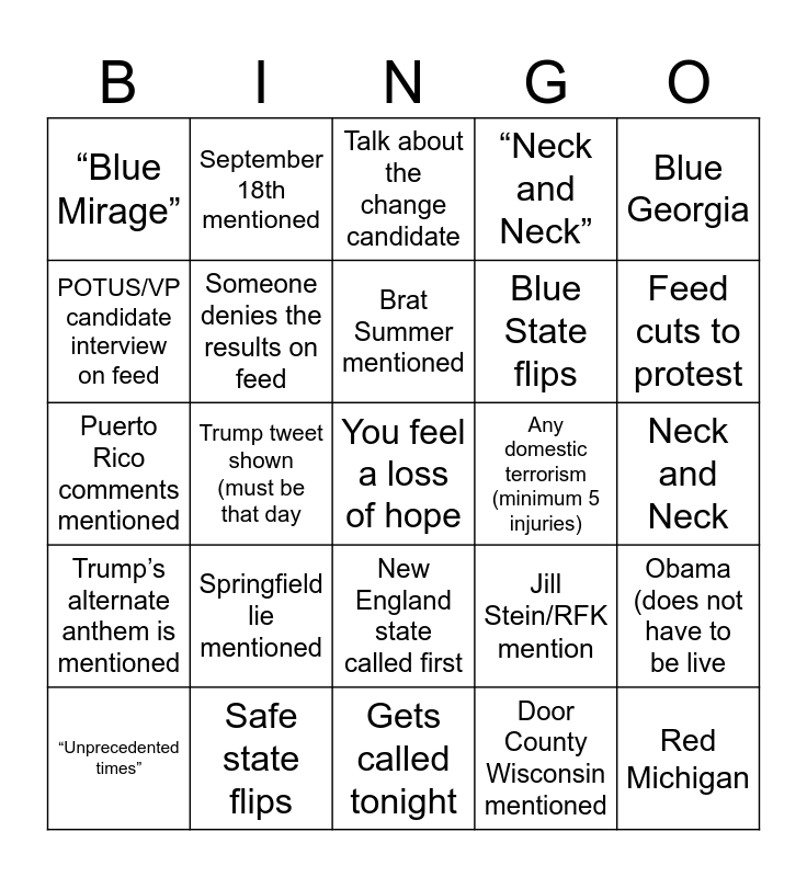 This bingo card has a free space and 24 words: “Unprecedented times”, Springfield lie mentioned, Brat Summer mentioned, Door County Wisconsin mentioned, Blue Georgia, “Blue Mirage”, September 18th mentioned, Talk about the change candidate, Any domestic terrorism (minimum 5 injuries), Neck and Neck, Puerto Rico comments mentioned, Someone denies the results on feed, Jill Stein/RFK mention, Obama (does not have to be live, POTUS/VP candidate interview on feed, Safe state flips, Gets called tonight, “Neck and Neck”, Feed cuts to protest, Trump’s alternate anthem is mentioned, Trump tweet shown (must be that day, New England state called first, Blue State flips and Red Michigan.