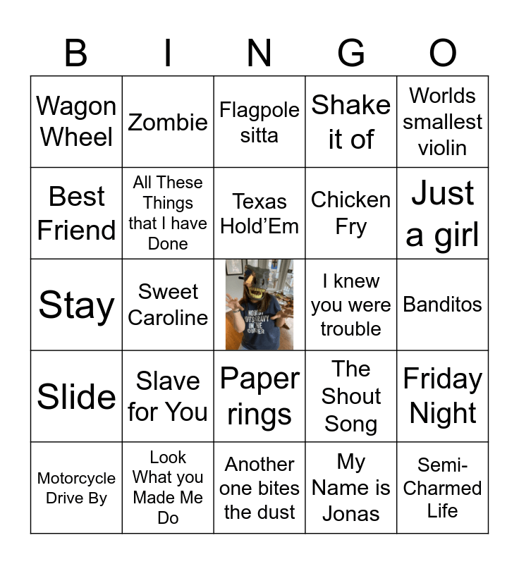 This bingo card has a free space and 45 words: Wonderwall, Semi-Charmed Life, EveryBody, Motorcycle Drive By, Mr Brightside, My Name is Jonas, Flagpole sitta, Burn the house down, Worlds smallest violin, Look What you Made Me Do, Shake it of, I knew you were trouble, Paper rings, Slave for You, Peaches, Another one bites the dust, All the small things, Stay, Since You’ve Been Gone, Just a girl, Zombie, I Want it That Way, All Night Long, Wagon Wheel, Inside Out, Banditos, You’ll Be Back, Don’t Stop me Know, The Shout Song, Slide, Why Bother, Friday Night, Hot to Go, Total Eclipse of the Heart, Don’t Go Breaking My Heart, Sweet Caroline, All Star, Never Gonna Give You Up, Like A Prayer, Texas Hold’Em, Best Friend, Chicken Fry, Dixieland Delight, All These Things that I have Done and Call Me Maybe.
