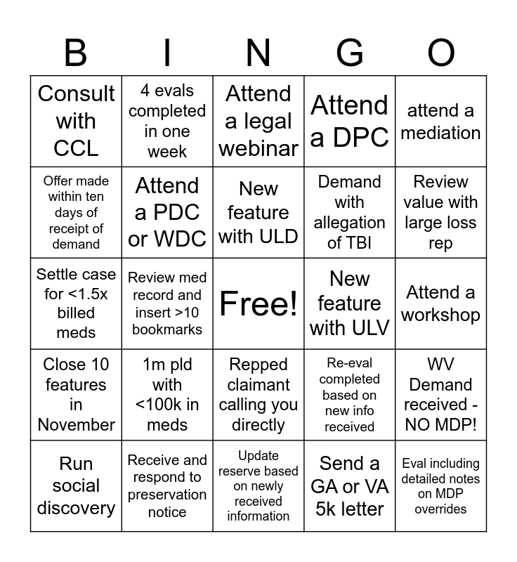 This bingo card has a free space and 24 words: 1m pld with <100k in meds, Receive and respond to preservation notice, New feature with ULD, Run social discovery, attend a mediation, Consult with CCL, Offer made within ten days of receipt of demand, 4 evals completed in one week, New feature with ULV, Repped claimant calling you directly, Demand with allegation of TBI, Settle case for <1.5x billed meds, Re-eval completed based on new info received, WV Demand received - NO MDP!, Attend a PDC or WDC, Send a GA or VA 5k letter, Attend a workshop, Attend a legal webinar, Review value with large loss rep, Review med record and insert >10 bookmarks, Eval including detailed notes on MDP overrides, Close 10 features in November, Attend a DPC and Update reserve based on newly received information.