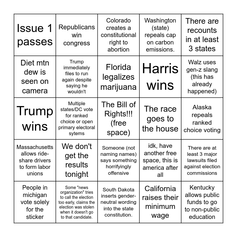 This bingo card has a free space and 24 words: We don't get the results tonight, Some "news organization" tries to call the election too early, claims the election was stolen when it doesn't go to that candidate., Florida legalizes marijuana, People in michigan vote solely for the sticker, There are recounts in at least 3 states, Issue 1 passes, Diet mtn dew is seen on camera, Republicans win congress, The race goes to the house, Someone (not naming names) says something horrifyingly offensive, Harris wins, Trump wins, idk, have another free space, this is america after all, There are at least 3 major lawsuits filed against election commissions, Trump immediately files to run again despite saying he wouldn't, California raises their minimum wage, Alaska repeals ranked choice voting, Colorado creates a constitutional right to abortion, Walz uses gen-z slang (this has already happened), Multiple states/DC vote for ranked choice or open primary electoral sytems, Kentucky allows public funds to go to non-public education, Massachusetts allows ride-share drivers to form labor unions, Washington (state) repeals cap on carbon emissions. and South Dakota inserts gender-neutral wording into the state constitution..