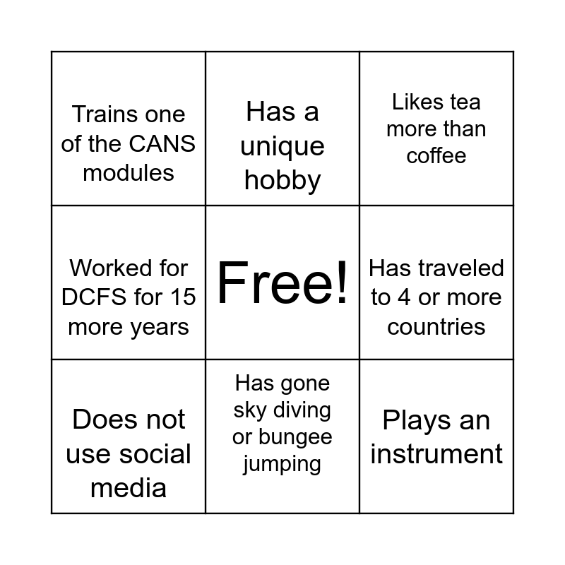 This bingo card has a free space and 8 words: Has traveled to 4 or more countries, Likes tea more than coffee, Has a unique hobby, Does not use social media, Trains one of the CANS modules, Plays an instrument, Worked for DCFS for 15 more years and Has gone sky diving or bungee jumping.