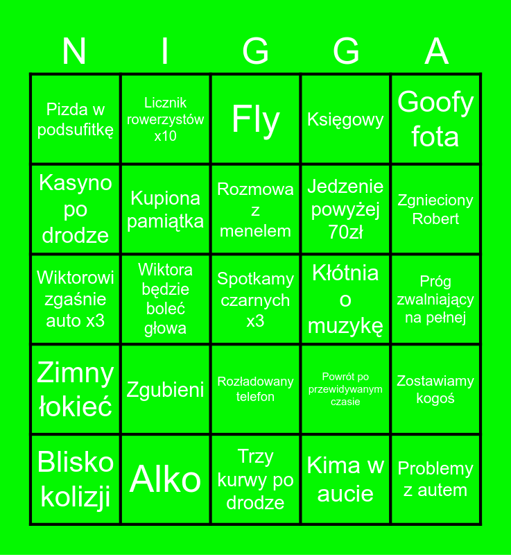 This bingo card has 25 words: Zgubieni, Trzy kurwy po drodze, Rozmowa z menelem, Blisko kolizji, Goofy fota, Pizda w podsufitkę, Kasyno po drodze, Licznik rowerzystów x10, Kłótnia o muzykę, Rozładowany telefon, Jedzenie powyżej 70zł, Wiktorowi zgaśnie auto x3, Powrót po przewidywanym czasie, Zostawiamy kogoś, Kupiona pamiątka, Problemy z autem, Próg zwalniający na pełnej, Fly, Zgnieciony Robert, Wiktora będzie boleć głowa, Spotkamy czarnych x3, Alko, Zimny łokieć, Księgowy and Kima w aucie.