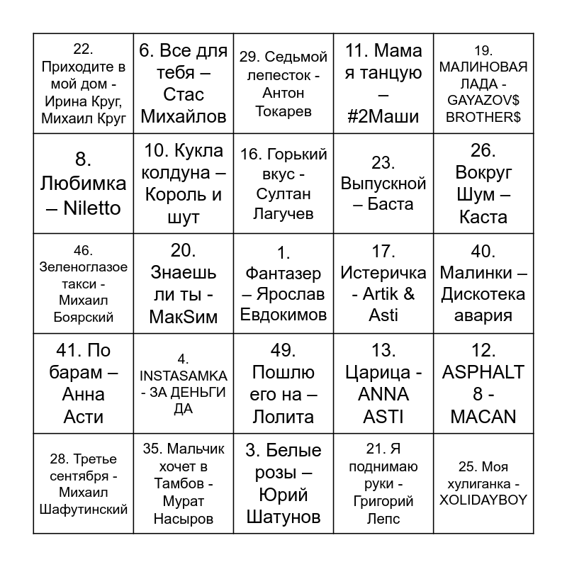 This bingo card has 51 words: Free!, 1. Фантазер – Ярослав Евдокимов, 2. С днем рождения – Ирина Аллегрова, 3. Белые розы – Юрий Шатунов, 4. INSTASAMKA - ЗА ДЕНЬГИ ДА, 5. 18 мне уже – Руки Вверх, 6. Все для тебя – Стас Михайлов, 7. Девушки как звезды – Андрей Губин, 8. Любимка – Niletto, 9. Угонщица – Ирина Аллегрова, 10. Кукла колдуна – Король и шут, 11. Мама я танцую – #2Маши, 12. ASPHALT 8 - MACAN, 13. Царица - ANNA ASTI, 14. Крошка моя – Руки Вверх, 15. Птичка HammAli & Navai, 16. Горький вкус - Султан Лагучев, 17. Истеричка - Artik & Asti, 18. Лесник - Король и Шут, 19. МАЛИНОВАЯ ЛАДА - GAYAZOV$ BROTHER$, 20. Знаешь ли ты - МакSим, 21. Я поднимаю руки - Григорий Лепс, 22. Приходите в мой дом - Ирина Круг, Михаил Круг, 23. Выпускной – Баста, 24. Девочка-война - HammAli & Navai, 25. Моя хулиганка - XOLIDAYBOY, 26. Вокруг Шум – Каста, 27. Наступает ночь – Мираж, 28. Третье сентября - Михаил Шафутинский, 29. Седьмой лепесток - Антон Токарев, 30. Беспечный ангел – Ария, 31. Выпьем за любовь - Игорь Николаев, 32. Хоп-хей ла ла лей - Агутин Леонид, 33. Останусь - Город 312, 34. Зацепила – Артур Пирожков, 35. Мальчик хочет в Тамбов - Мурат Насыров, 36. Выхода нет – Сплин, 37. Танцы - Reflex, 38. Самый лучший день – Григорий Лепс, 39. Солнце Монако – Люся Чеботина, 40. Малинки – Дискотека авария, 41. По барам – Анна Асти, 42. Где прошла ты- Кравц, Гио Пика, 43. Так красиво – Сергей Лазарев, 44. Рюмка водки – Григорий Лепс, 45. Марджанджа - Михаил Шуфутинский, 46. Зеленоглазое такси - Михаил Боярский, 47. Владивосток 2000 – Муми Тролл, 48. Три полоски - Animal ДжаZ, 49. Пошлю его на – Лолита and 50. Медляк - Mr. Credo..