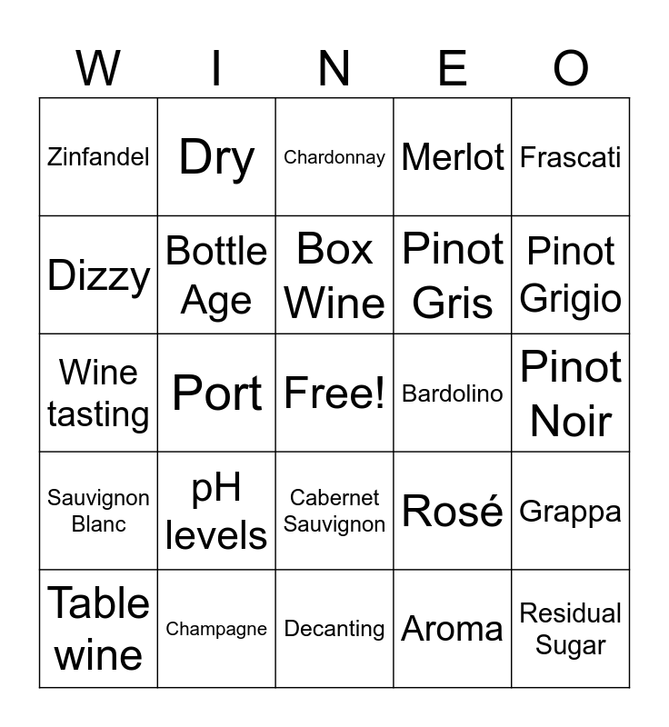 This bingo card has a free space and 69 words: Riesling, Pinot Noir, Marsala, Lambrusco, Champagne, Cortese, Merlot, Syrah, Frascati, Pinot Blanc, Grappa, Bordeaux, Zinfandel, Chardonnay, Chianti, Port, Cabernet Sauvignon, Pinot Gris, Malbec, Sauvignon Blanc, Bardolino, Rosé, Pinot Grigio, Moscato, Sherry, Cheers!, Cork Screw, Delicious, Aroma, Color, Dry, Sweet, Earthy, Fermentation, Full-bodied, Harvest, Hybrid, Aspirin, Dizzy, Oxidized, pH levels, Residual Sugar, Sommelier, Secondary fermentation, Tannin, Table wine, Varietal, Wine glass, Wine Pairing, Bottle Age, Box Wine, Carbon Dioxide, Crush Grapes, Decanting, Extraction, Finish, Grand Reserve, Jeroboam, Vinology, Wine tasting, Yield, Reserve, Ranking, Observation, Double bottle, Hungover, Girls night, Uber and No thank you.