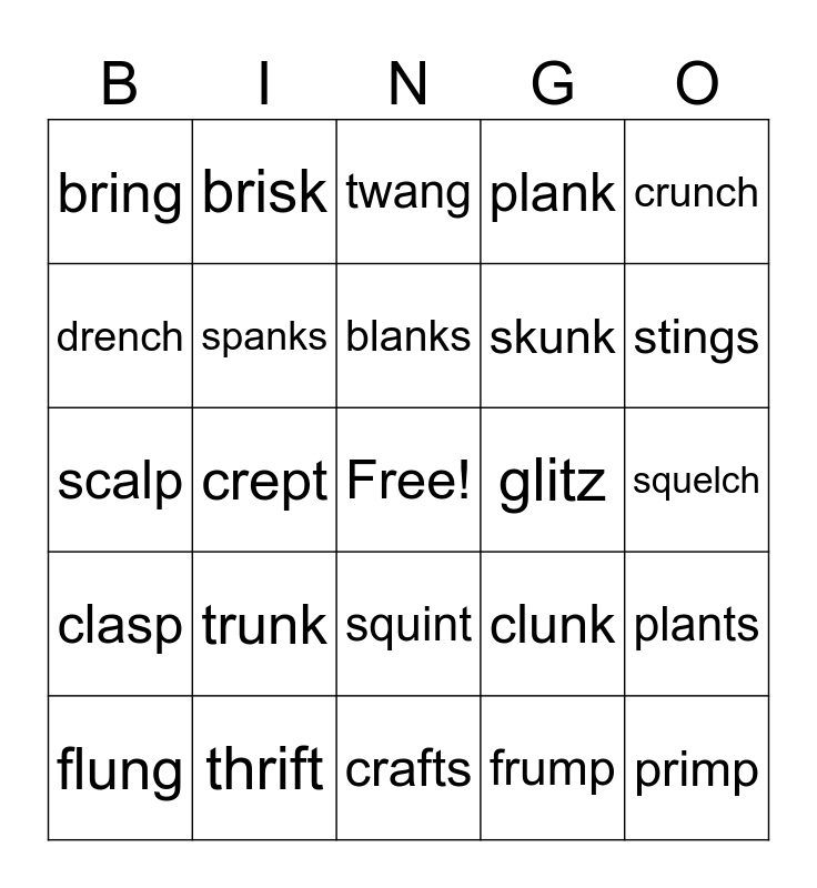 This bingo card has a free space and 24 words: trunk, thrift, blanks, flung, crunch, bring, drench, brisk, glitz, squint, skunk, scalp, clunk, plants, spanks, frump, squelch, twang, stings, crept, primp, clasp, plank and crafts.