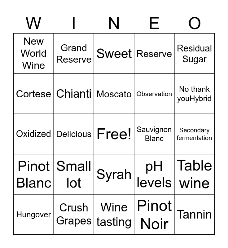 This bingo card has a free space and 71 words: Fruity, Grand Reserve, Jeroboam, Vinology, Wine tasting, Yield, Reserve, Ranking, Observation, Double bottle, Hungover, Girls night, No thank youHybrid, New World Wine, Oaky, Oxidized, pH levels, Residual Sugar, Sommelier, Secondary fermentation, Small lot, Tannin, Table wine, Varietal, Wine glass, Wine Pairing, Bottle Age, Box Wine, Carbon Dioxide, Cold fermentation, Crush Grapes, Decanting, Extraction, Finish Riesling, Pinot Noir, Marsala, Lambrusco, Champagne, Cortese, Merlot, Syrah, Frascati, Pinot Blanc, Grappa, Bordeaux, Zinfandel, Chardonnay, Chianti, Port, Cabernet Sauvignon, Pinot Gris, Malbec, Sauvignon Blanc, Bardolino, Rosé, Pinot Grigio, Moscato, Gamay, Sherry, Cheers!, Wine Opener, Cork Screw, Delicious, Aroma, Color, Dry, Sweet, Earthy, Fermentation, Full-bodied and Harvest.