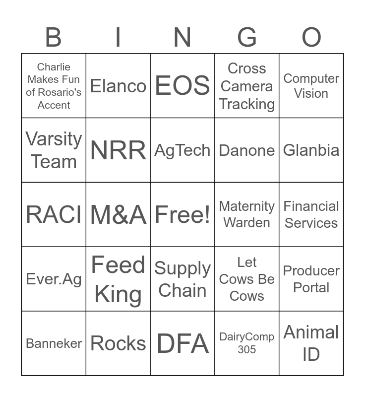 This bingo card has a free space and 39 words: ARR, RUMEN MICROBIOME, OK, Perfect!, NRR, Banneker, Supply Chain, AgTech, Digital Twin, Computer Vision, Ever.Ag, M&A, Cross Camera Tracking, Animal ID, Financial Services, Maternity Warden, Feed King, AI, Charlie Makes Fun of Rosario's Accent, "Let's take a step back", Let Cows Be Cows, Varsity Team, DFA, Danone, Glanbia, Product Roadmap, Business Case, Treat Every Cow, Like Your Only Cow, Animal Welfare, ESG, Elanco, Zoetis, ELS, EOS, Rocks, DairyComp 305, Node, Producer Portal, RACI and Philadelphia.
