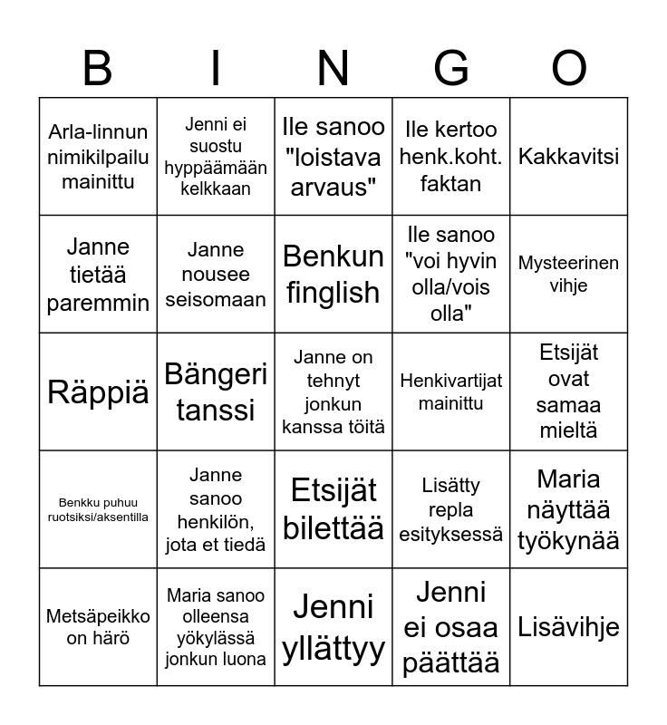 This bingo card has a free space and 24 words: Janne sanoo henkilön, jota et tiedä, Maria sanoo olleensa yökylässä jonkun luona, Benkun finglish, Metsäpeikko on härö, Kakkavitsi, Arla-linnun nimikilpailu mainittu, Janne tietää paremmin, Jenni ei suostu hyppäämään kelkkaan, Henkivartijat mainittu, Etsijät bilettää, Ile sanoo "voi hyvin olla/vois olla", Räppiä, Lisätty repla esityksessä, Maria näyttää työkynää, Janne nousee seisomaan, Jenni ei osaa päättää, Etsijät ovat samaa mieltä, Ile sanoo "loistava arvaus", Mysteerinen vihje, Bängeri tanssi, Lisävihje, Benkku puhuu ruotsiksi/aksentilla, Ile kertoo henk.koht. faktan and Jenni yllättyy.