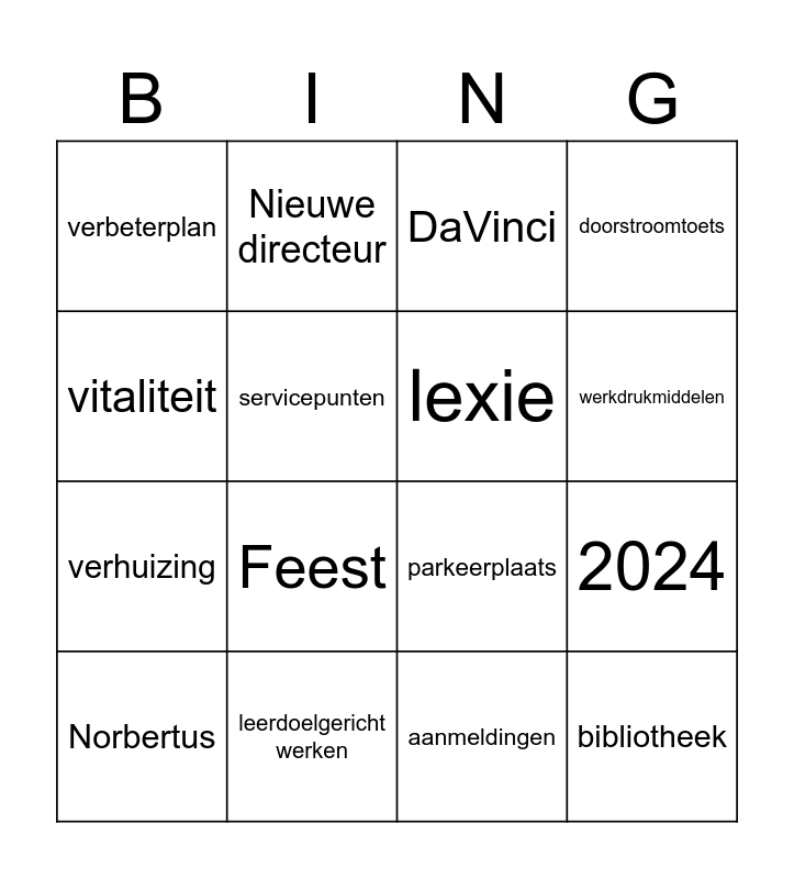 This bingo card has 20 words: Norbertus, gertrudis, DaVinci, 2024, Top-lessen, Feest, aanmeldingen, doorstroomtoets, verhuizing, Nieuwe directeur, parkeerplaats, werkdrukmiddelen, verbeterplan, leerdoelgericht werken, lexie, boom, vitaliteit, servicepunten, basisvaardigheden and bibliotheek.