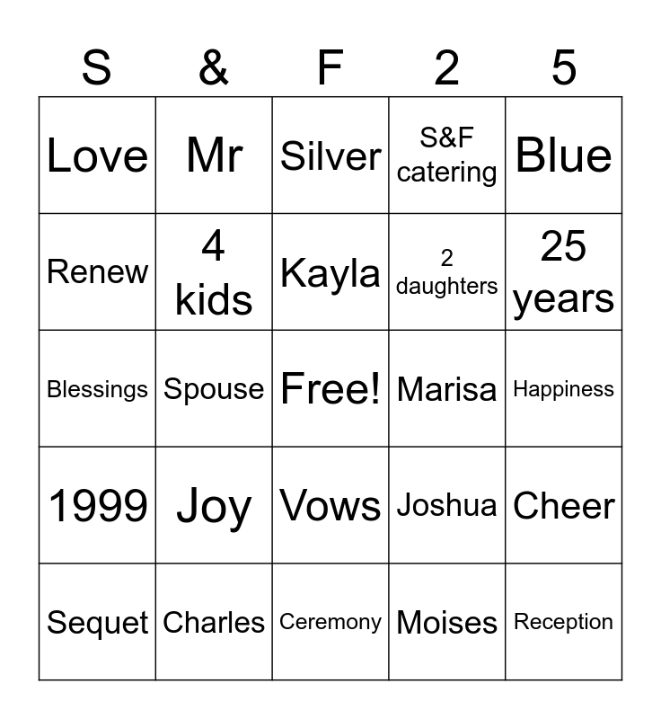 This bingo card has a free space and 34 words: Family, Moises, Finette, Anniversary, 1999, 4 kids, Blue, Sequet, Mr, Wife, Kayla, Silver, Mrs, Husband, Marisa, 25 years, Charles, Blessings, Joy, Joshua, Vows, Highschool sweethearts, Love, Happiness, Ceremony, Reception, S&F catering, 2 sons, 2 daughters, Renew, Special song, Spouse, Cheer and Celebration.