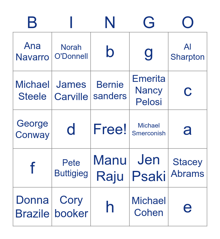 This bingo card has a free space and 24 words: Pete Buttigieg, Cory booker, Bernie sanders, Donna Brazile, Al Sharpton, Ana Navarro, Michael Steele, Norah O'Donnell, Michael Smerconish, Manu Raju, Emerita Nancy Pelosi, George Conway, Jen Psaki, Stacey Abrams, James Carville, Michael Cohen, a, b, c, d, e, f, g and h.