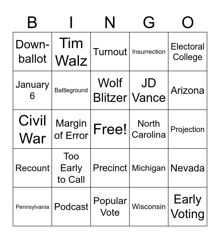 This bingo card has a free space and 31 words: Popular Vote, Georgia, Margin of Error, Returns, Down-ballot, Turnout, Battleground, Michigan, North Carolina, Wisconsin, Projection, Early Voting, Tabulate, Absentee Ballot, Arizona, Exit Polls, Nevada, Too Early to Call, Recount, Precinct, Electoral College, Path to 270, Pennsylvania, Tim Walz, JD Vance, January 6, Insurrection, Civil War, Podcast, Wolf Blitzer and Anderson Cooper.