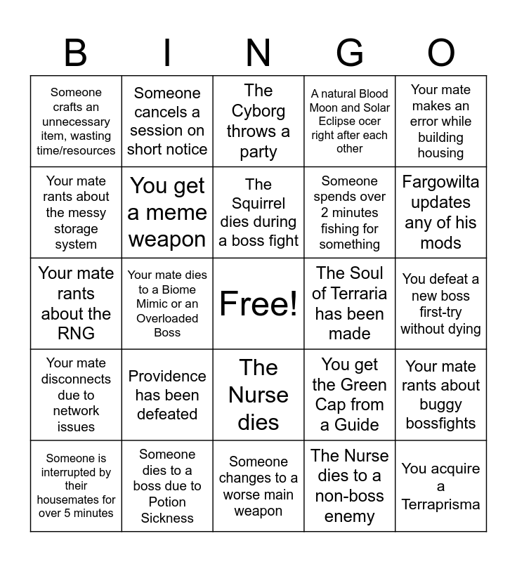 This bingo card has a free space and 26 words: The Nurse dies, The Nurse dies to a non-boss enemy, The Squirrel dies during a boss fight, Someone dies to a boss due to Potion Sickness, Your mate makes an error while building housing, Someone crafts an unnecessary item, wasting time/resources, Your mate rants about the messy storage system, Someone cancels a session on short notice, You defeat a new boss first-try without dying, You get the Green Cap from a Guide, Someone spends over 2 minutes fishing for something, Your mate rants about the RNG, Your mate rants about buggy bossfights, Someone is interrupted by their housemates for over 5 minutes, Your mate dies to a Biome Mimic or an Overloaded Boss, Your mate ignores your /kiss command, A natural Blood Moon and Solar Eclipse ocer right after each other, Your mate disconnects due to network issues, The Cyborg throws a party, You acquire a Terraprisma, Fargowilta updates any of his mods, Someone changes to a worse main weapon, The Soul of Terraria has been made, Providence has been defeated, You get a meme weapon and Your lose non-minor progress to a game crash.
