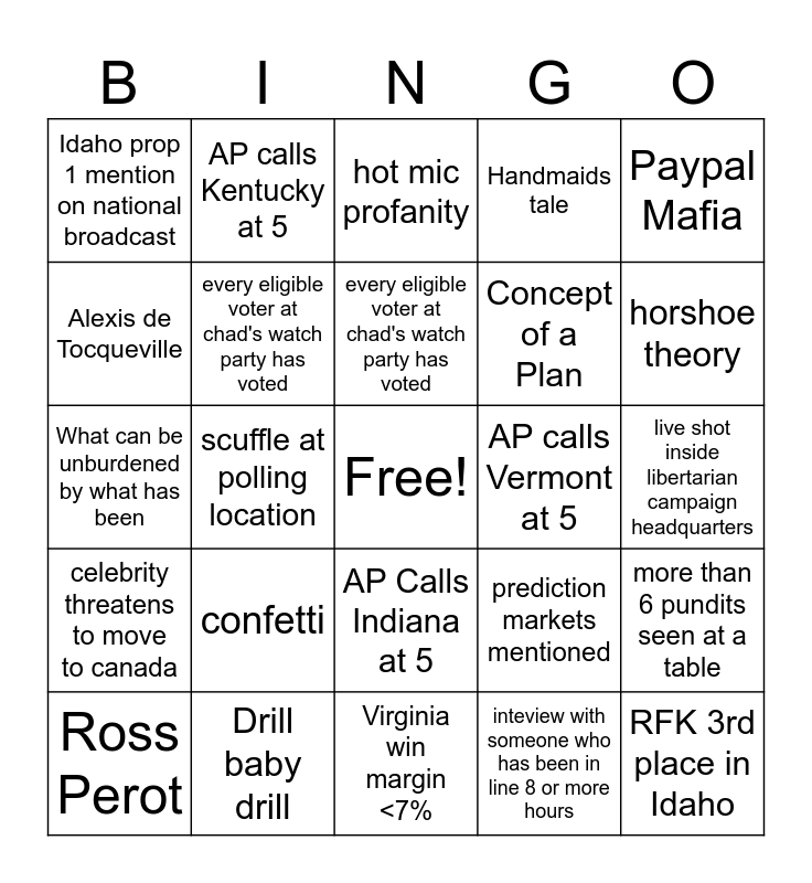 This bingo card has a free space and 24 words: confetti, Drill baby drill, every eligible voter at chad's watch party has voted, Ross Perot, Paypal Mafia, Idaho prop 1 mention on national broadcast, Alexis de Tocqueville, AP calls Kentucky at 5, AP calls Vermont at 5, AP Calls Indiana at 5, Concept of a Plan, What can be unburdened by what has been, prediction markets mentioned, more than 6 pundits seen at a table, every eligible voter at chad's watch party has voted, inteview with someone who has been in line 8 or more hours, live shot inside libertarian campaign headquarters, hot mic profanity, horshoe theory, scuffle at polling location, RFK 3rd place in Idaho, celebrity threatens to move to canada, Handmaids tale and Virginia win margin <7%.