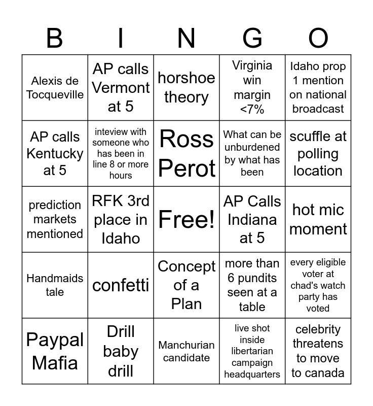 This bingo card has a free space and 24 words: confetti, Drill baby drill, Ross Perot, Paypal Mafia, Idaho prop 1 mention on national broadcast, Alexis de Tocqueville, AP calls Kentucky at 5, AP calls Vermont at 5, AP Calls Indiana at 5, Concept of a Plan, What can be unburdened by what has been, prediction markets mentioned, more than 6 pundits seen at a table, every eligible voter at chad's watch party has voted, inteview with someone who has been in line 8 or more hours, live shot inside libertarian campaign headquarters, hot mic moment, horshoe theory, scuffle at polling location, RFK 3rd place in Idaho, celebrity threatens to move to canada, Handmaids tale, Virginia win margin <7% and Manchurian candidate.
