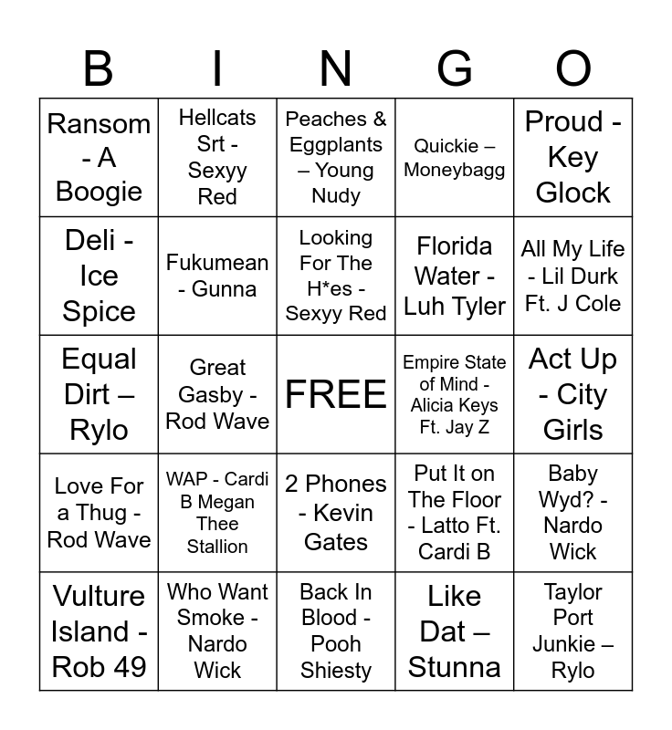 This bingo card has a free space and 75 words: Dreams And Nightmare - Meek Mill, No Flockin - Kodak Black, Peaches & Eggplants – Young Nudy, We Paid - Lil Baby, Freestyle - Lil Baby, Set It Off - Boosie, Wockesha – Moneybagg Yo, 'Not Like Us' by Kendrick Lamar, First Day Out - Tee Grizzly, Roll In Peace - Kodak Black, Nurse – Youngboy, "Yeah Glo!" – GloRilla, Looking For The H*es - Sexyy Red, Deli - Ice Spice, Turn To Clic Up - Quavo, Great Gasby - Rod Wave, Get Back - YTB FATT, Taylor Port Junkie – Rylo, Shake Yo Dreads - Sexyy Red, Proud - Key Glock, Mama - Rob 49, Equal Dirt – Rylo, Fukumean - Gunna, Hellcats Srt - Sexyy Red, Quickie – Moneybagg, Thang For You – Rylo, Munch - Ice Spice, Energy – Drake, Lick Or Sum - Glorilla, F.N.F. - Glorilla, Area Codes - Kali, Skeeyee - Sexyy Red, Highly Performing – Hunxho, Put It on The Floor - Latto Ft. Cardi B, All My Life - Lil Durk Ft. J Cole, Florida Water - Luh Tyler, Act Bad - City Girls, I’ll Take Your Man - City Girls, Act Up - City Girls, Like Dat – Stunna, 5 Star - Boston Richey, Glock In My Lap - Metro Boomin, Don’t Play with It - Lola Brooke, Hotel Lobby - Quavo, Handsome And Wealthy - Migos, 5500 Degrees - Est Gee, Vulture Island - Rob 49, Ransom - A Boogie, 2 Million Up – Peezy, Keep Dissin - Boston Richey, Took Her to The O - King Von, 2 Phones - Kevin Gates, Perc 10 – Peezy, Ahhh Ha - Lil Durk, Still Think About You - A Boogie, Preach - Young Dolph, Walk Around the Club – Treal Lee & Prince Rick, Is Ya Ready - Kay Flock, Maybach - 42 Dugg, Faneto - Chief Keef, WAP - Cardi B Megan Thee Stallion, B*tch From the South - Latto, High School - Nicki Minaj, Pound Town - Sexyy Red, Poison - Rod Wave, Empire State of Mind - Alicia Keys Ft. Jay Z, Rich Baby Daddy - Drake, Love Sosa - Chief Keef, Vette Motors – Youngboy, Baby Wyd? - Nardo Wick, Love For a Thug - Rod Wave, Who Want Smoke - Nardo Wick, Lifestyle - Rich Homie Quan & Young Thug, Back In Blood - Pooh Shiesty and Dior - Pop Smoke.