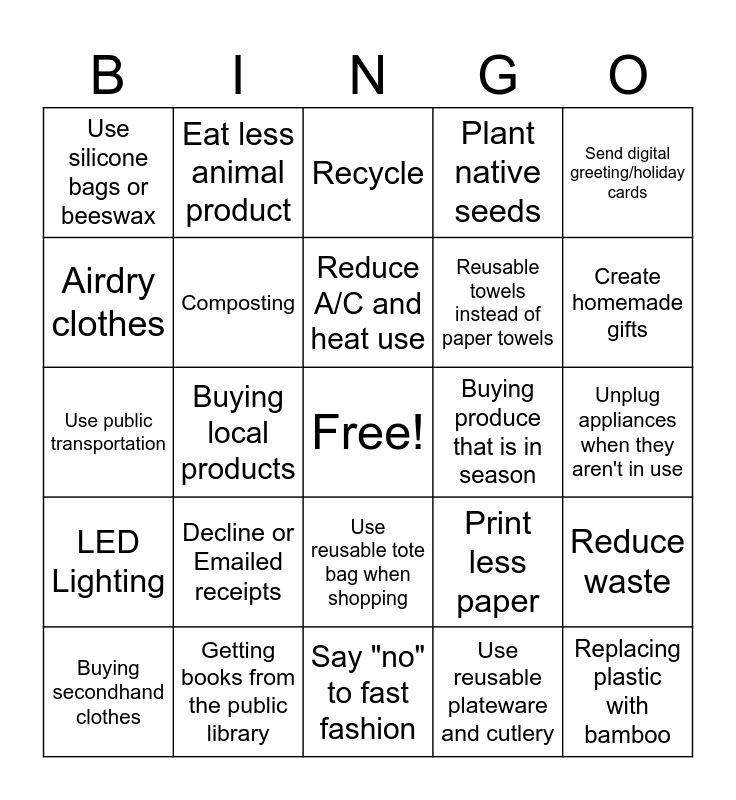 This bingo card has a free space and 29 words: Buying secondhand clothes, Biking, Buying local products, Use a reusable water bottle, Use silicone bags or beeswax, Recycle, Composting, Decline or Emailed receipts, Buying produce that is in season, Getting books from the public library, Unplug appliances when they aren't in use, Replacing plastic with bamboo, Say "no" to fast fashion, Use reusable plateware and cutlery, Create homemade gifts, Use bags for gifts to keep & reuse, Use reusable tote bag when shopping, LED Lighting, Send digital greeting/holiday cards, Use public transportation, Print less paper, Eat leftovers, Reusable towels instead of paper towels, Airdry clothes, Plant native seeds, Eat less animal product, Reduce waste, Reduce A/C and heat use and Walking.