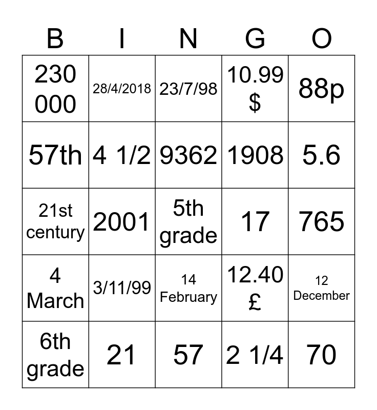 This bingo card has a free space and 24 words: 3/11/99, 21, 9362, 6th grade, 88p, 230 000, 57th, 28/4/2018, 17, 14 February, 1908, 21st century, 12.40 £, 12 December, 4 1/2, 2 1/4, 765, 23/7/98, 5.6, 2001, 70, 4 March, 10.99 $ and 57.