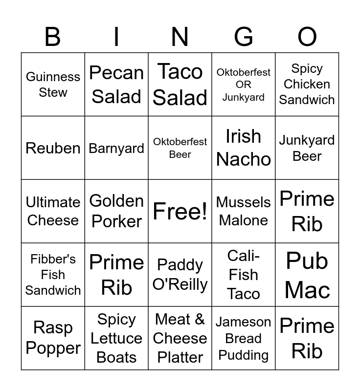 This bingo card has a free space and 24 words: Prime Rib, Spicy Lettuce Boats, Oktoberfest Beer, Rasp Popper, Spicy Chicken Sandwich, Guinness Stew, Reuben, Pecan Salad, Mussels Malone, Paddy O'Reilly, Irish Nacho, Ultimate Cheese, Cali- Fish Taco, Pub Mac, Barnyard, Jameson Bread Pudding, Prime Rib, Taco Salad, Junkyard Beer, Golden Porker, Prime Rib, Fibber's Fish Sandwich, Oktoberfest OR Junkyard and Meat & Cheese Platter.