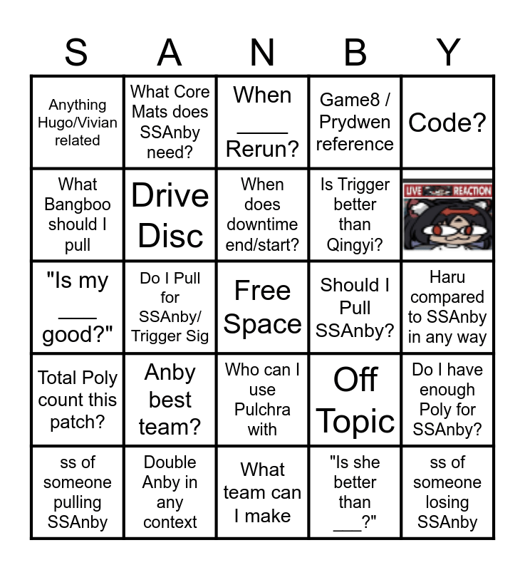 This bingo card has 1 images, a free space and 23 words: ss of someone pulling SSAnby, Anby best team?, When does downtime end/start?, "Is she better than ___?", Code?, Anything Hugo/Vivian related, What Core Mats does SSAnby need?, When ____ Rerun?, Should I Pull SSAnby?, Haru compared to SSAnby in any way, "Is my ___ good?", Drive Disc, Off Topic, Do I have enough Poly for SSAnby?, What Bangboo should I pull, Double Anby in any context, What team can I make, Game8 / Prydwen reference, Total Poly count this patch?, Do I Pull for SSAnby/ Trigger Sig, Who can I use Pulchra with, Is Trigger better than Qingyi? and ss of someone losing SSAnby.