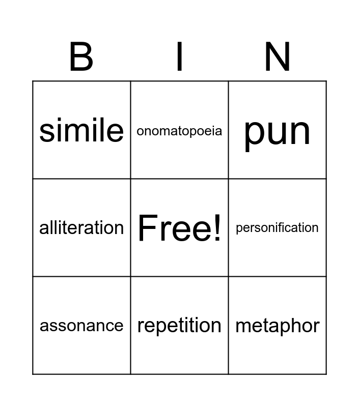 This bingo card has a free space and 10 words: repetition, pun, simile, metaphor, alliteration, assonance, onomatopoeia, internal rhyme, personification and symbolism.