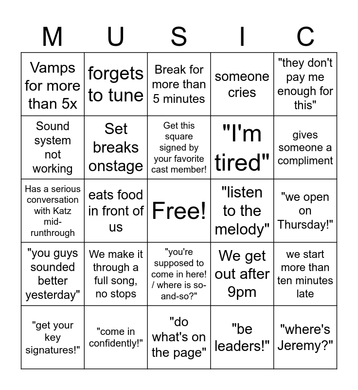 This bingo card has a free space and 29 words: "get your key signatures!", "watch me!", eats food in front of us, "you gotta have this learned", Vamps for more than 5x, Break for more than 5 minutes, Set breaks onstage, We make it through a full song, no stops, "listen to the melody", "come in confidently!", "we open on Thursday!", "where's Jeremy?", "do what's on the page", "be leaders!", gives someone a compliment, "do it that way every time!", "you're supposed to come in here! / where is so-and-so?", "you guys sounded better yesterday", "they don't pay me enough for this", Has a serious conversation with Katz mid-runthrough, We get out after 9pm, "stop talking/no side conversations!", "I'm tired", Sound system not working, someone cries, forgets to tune, we start more than ten minutes late, Get this square signed by your favorite cast member! and Take a selfies with Davies.
