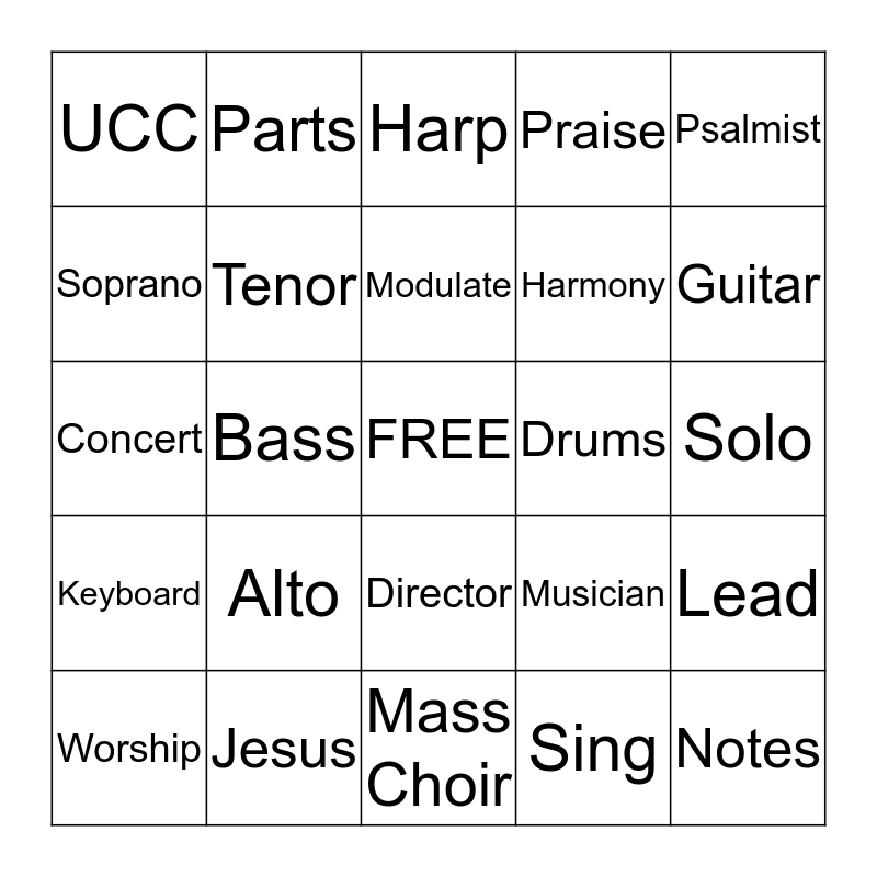 This bingo card has a free space and 24 words: Alto, Jesus, Modulate, Worship, Psalmist, UCC, Soprano, Parts, Drums, Director, Harmony, Concert, Musician, Lead, Tenor, Sing, Solo, Harp, Guitar, Bass, Notes, Keyboard, Praise and Mass Choir.
