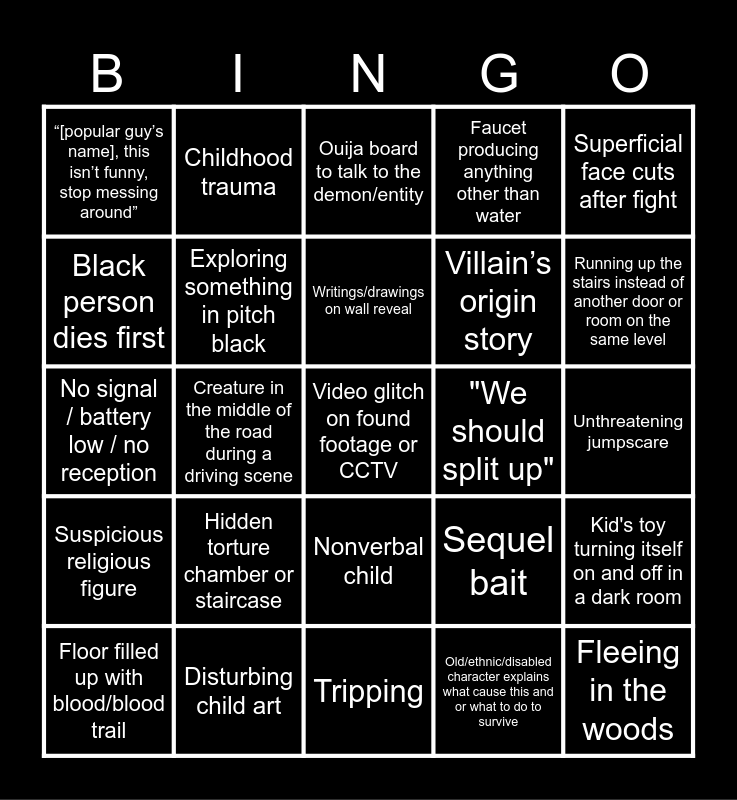This bingo card has 41 words: Phone call cuts to dial tone, No signal / battery low / no reception, Character sees something in reflection, turns around and there’s nothing there, Exploring something in pitch black, Disturbing child art, Nonverbal child, Writings/drawings on wall reveal, Any black animal, Superficial face cuts after fight, Suspicious religious figure, Creature in the middle of the road during a driving scene, Faucet producing anything other than water, Video glitch on found footage or CCTV, Unthreatening jumpscare, "We should split up", Hidden torture chamber or staircase, Self-opening/closing door, “[popular guy’s name], this isn’t funny, stop messing around”, Dropping the weapon immediately after subduing the villain with it, Ouija board to talk to the demon/entity, Kid's toy turning itself on and off in a dark room, Fleeing in the woods, Tripping, Villain’s origin story, Someone getting killed off screen, 1 cop with no back up, Old/ethnic/disabled character explains what cause this and or what to do to survive, October, Running up the stairs instead of another door or room on the same level, Car trouble, Intentional wounds for ritual, Childhood trauma, Floor filled up with blood/blood trail, Catchphrase to save a main character, Sequel bait, Black person dies first, Shower/bath scene, Having a nightmare, Begins with upbeat song, Irrational actions when told what to do and Only the kid sees the entity.