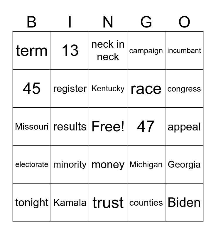 This bingo card has a free space and 24 words: minority, Kamala, Kentucky, tonight, incumbant, term, 45, 13, 47, money, race, Missouri, Michigan, Georgia, register, counties, appeal, neck in neck, congress, results, Biden, electorate, campaign and trust.