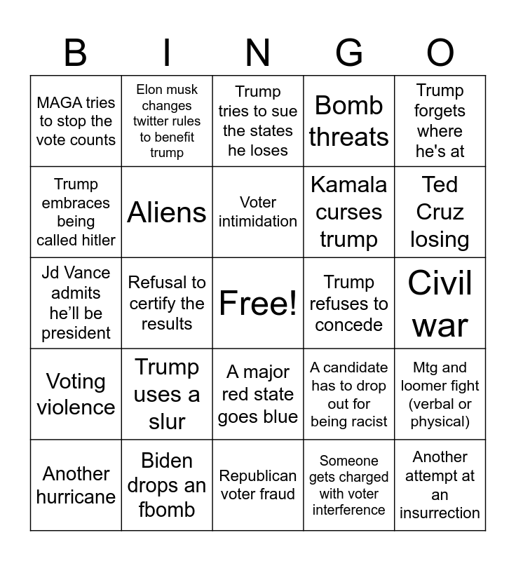 This bingo card has a free space and 24 words: Trump uses a slur, Biden drops an fbomb, Voter intimidation, Another hurricane, Trump forgets where he's at, MAGA tries to stop the vote counts, Trump embraces being called hitler, Elon musk changes twitter rules to benefit trump, Trump refuses to concede, A major red state goes blue, Kamala curses trump, Jd Vance admits he’ll be president, A candidate has to drop out for being racist, Mtg and loomer fight (verbal or physical), Aliens, Someone gets charged with voter interference, Civil war, Trump tries to sue the states he loses, Ted Cruz losing, Refusal to certify the results, Another attempt at an insurrection, Voting violence, Bomb threats and Republican voter fraud.