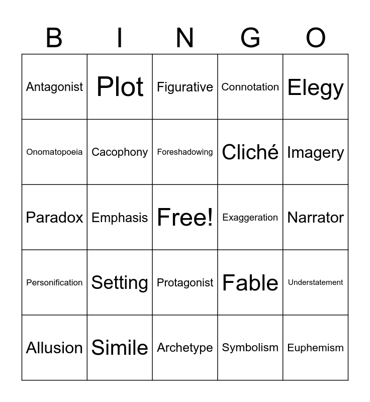 This bingo card has a free space and 57 words: Allegory, Allusion, Ambiguity, Antagonist, Archetype, Ballad, Cacophony, Caricature, Cliché, Climax, Connotation, Denotation, Dialect, Dialogue, Diction, Dramatic Irony, Elegy, Emphasis, Epitome, Euphemism, Exaggeration, Exposition, Fable, Figurative, Flashback, Foreshadowing, Hyperbole, Idiom, Imagery, Irony, Juxtaposition, Metaphor, Mood, Motif, Narrator, Onomatopoeia, Oxymoron, Paradox, Parody, Personification, Plot, Protagonist, Resolution, Rhyme, Rhythm, Satire, Setting, Simile, Soliloquy, Stanza, Stereotype, Symbolism, Theme, Tone, Tragedy, Understatement and Verse.