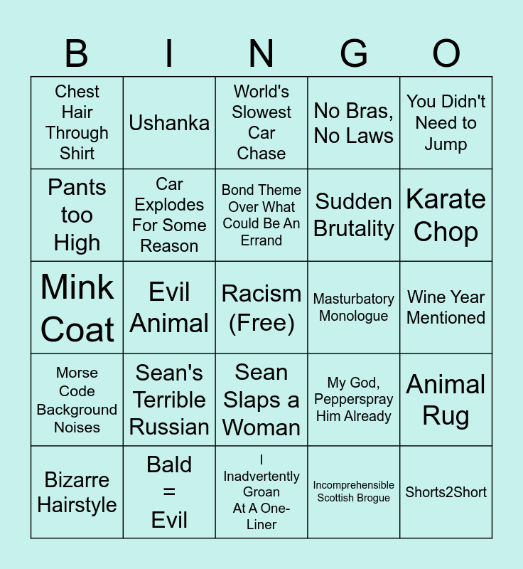 This bingo card has a free space and 24 words: Sean's Terrible Russian, Bald = Evil, Bond Theme Over What Could Be An Errand, Bizarre Hairstyle, You Didn't Need to Jump, Chest Hair Through Shirt, Pants too High, Ushanka, Masturbatory Monologue, Sean Slaps a Woman, Sudden Brutality, Mink Coat, My God, Pepperspray Him Already, Animal Rug, Car Explodes For Some Reason, Incomprehensible Scottish Brogue, Wine Year Mentioned, World's Slowest Car Chase, Karate Chop, Evil Animal, Shorts2Short, Morse Code Background Noises, No Bras, No Laws and I Inadvertently Groan At A One-Liner.