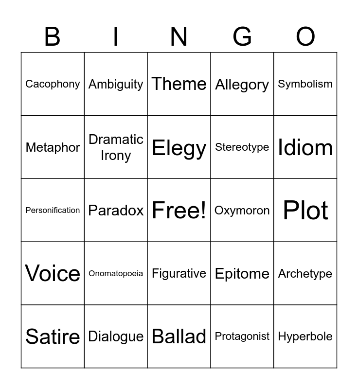 This bingo card has a free space and 44 words: nderstatement, Hyperbole, Mood, Satire, Stanza, Protagonist, Theme, Allusion, Symbolism, Dialogue, Allegory, Oxymoron, Figurative, Onomatopoeia, Rhyme, Ballad, Climax, Personification, Caricature, Idiom, Ambiguity, Tragedy, Emphasis, Cacophony, Soliloquy, Plot, Denotation, Foreshadowing, Epitome, Voice, Setting, Archetype, Exposition, Rhyme, Paradox, Juxtaposition, Narrator, Tone, Elegy, Metaphor, Stereotype, Wordplay, Dramatic Irony and Rhythm.